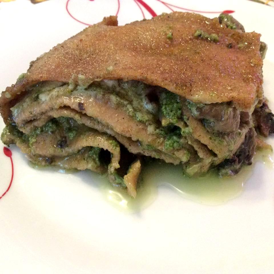 Dopodiché prendete teglia, mettete sulla base la crema di pesto e panna, stendete i fogli di pasta, crema e funghi, fogli di pasta, crema e funghi,mozzarella di riso per ogni strato che intendete realizzare. Nell'ultimo strato mettete pangrattato e semi di lino frullati.
