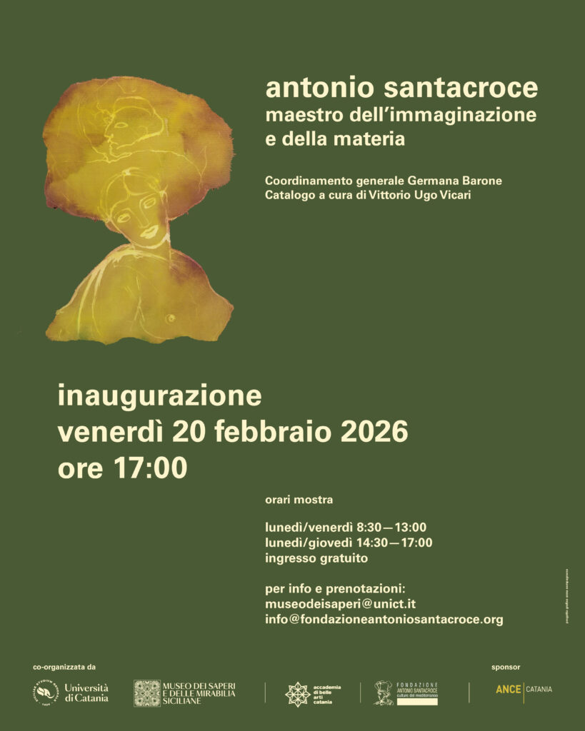 Dedicata al maestro originario di Rosolini e visitabile fino al 30 aprile, l’esposizione è coordinata da Germana Barone e accompagnata da un catalogo curato da Vittorio Ugo Vicari. L’iniziativa è promossa dall’Università degli Studi di Catania, dall’Accademia di Belle Arti di Catania e dalla Fondazione Antonio Santacroce – Culture del Mediterraneo, con il sostegno dell’ANCE – Associazione Nazionale Costruttori Edili di Catania e della Nuova Officina d’Arte.