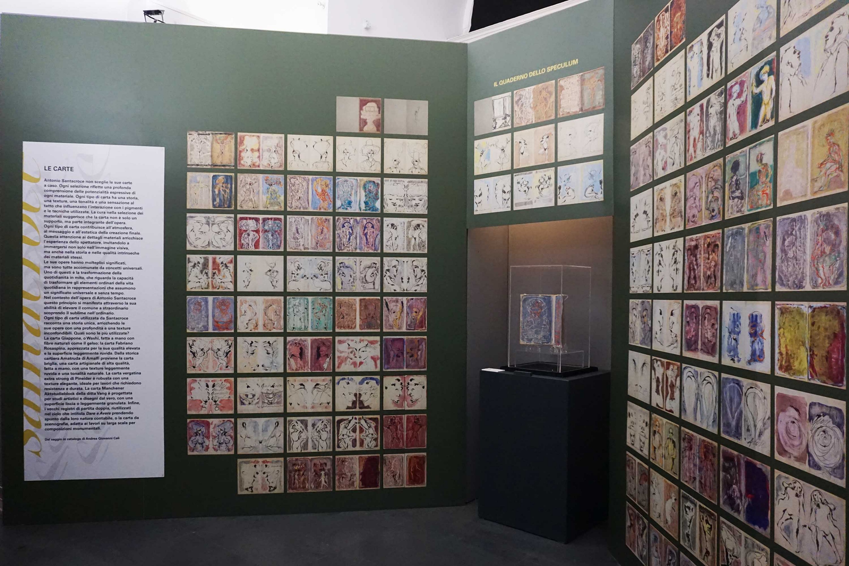 Numerosi inediti restituiscono uno sguardo privilegiato sui passaggi cruciali del percorso artistico di Santacroce. Al centro emerge la lunga e costante frequentazione con carte e cartiere, che si trasformano in autentica ossatura tecnica e concettuale di un modus operandi assolutamente singolare, dove materia e processo diventano parte integrante del pensiero creativo.