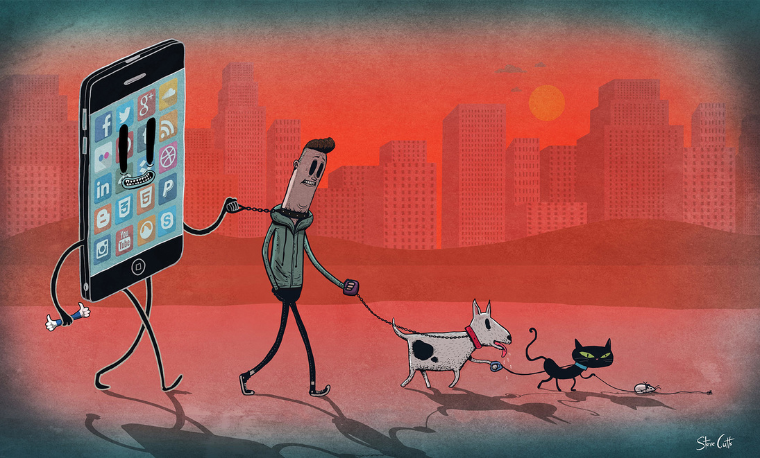 Quando pensa all'uomo moderno e all'uso che questi fa della tecnologia, Steve Cutts non può che disegnare dei morti viventi che si trascinano tenendo in mano uno smartphone. Quelli che vediamo sono esseri che non hanno più un'anima e non comunicano tra loro (cosa che può sembrare assurda nell'epoca dei social), esseri che seguono modelli di comportamento innaturali e mirano soltanto a soddisfare bisogni che gli sono stati imposti.
