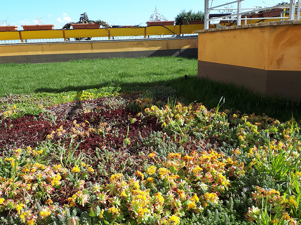 E proprio nel Centro ENEA Casaccia, sul tetto della “Scuola delle Energie”, è stata realizzata una copertura vegetale sperimentale: uno spessore di terreno di appena 20 cm accoglie piante resistenti sia all’aridità del suolo che al freddo (varie specie di Sedum ed erbe perenni, come l’Echium, noto come “erba viperina”), caratteristiche che le rendono ideali per quasi tutte le regioni della penisola e perfette per giardini a bassa manutenzione. «Questa copertura vegetale di tipo estensivo non supera i 100 kg di peso per metro quadro, ma quando viene irrigata, o in caso di pioggia, può arrivare a pesare fino a 6 volte tanto perché, al pari di una spugna, trattiene l’acqua anche per 2-4 ore prima di farla defluire lungo i discendenti dell’edificio. E questo è uno dei motivi per cui, nella fase di progettazione di un tetto verde, è fondamentale che un tecnico effettui anche il calcolo statico dell’edificio».