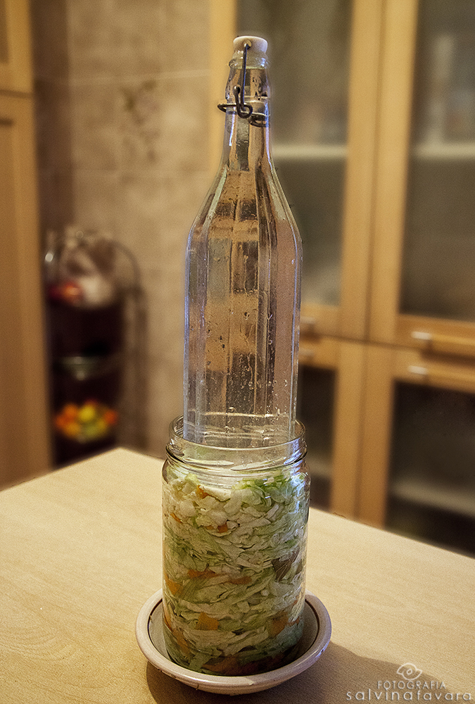 Un altro metodo utilizzabile è di mescolare le verdure, il sale e le spezie in una bacinella sufficientemente grande, e poi riempire il barattolo di vetro pressando bene ogni strato. Posizionare in cima il peso (ad esempio un piatto con sopra un pesante sasso, o una bottiglia di vetro riempita d'acqua), dopo qualche ora controllare che le verdure abbiano prodotto liquido a sufficienza da esserne ricoperte (è una fermentazione anaerobica), in caso contrario sciogliere 15-30 g di sale per litro d’acqua (come nella proporzione scelta inizialmente), portare ad una lieve ebollizione, lasciare raffreddare e aggiungere la quantità necessaria a ricoprire le verdure. Coprire con un panno e lasciare a temperatura ambiente pressando di tanto in tanto (20-22°C circa) per 5-10 giorni. Si possono iniziare a gustare già dopo 2 settimane, ricoperte del proprio liquido si conserveranno ottimamente per almeno 6 mesi. Se a fine fermentazione l'odore dovesse risultare sgradevole, qualcosa non ha funzionato, buttate tutto e riprovate.