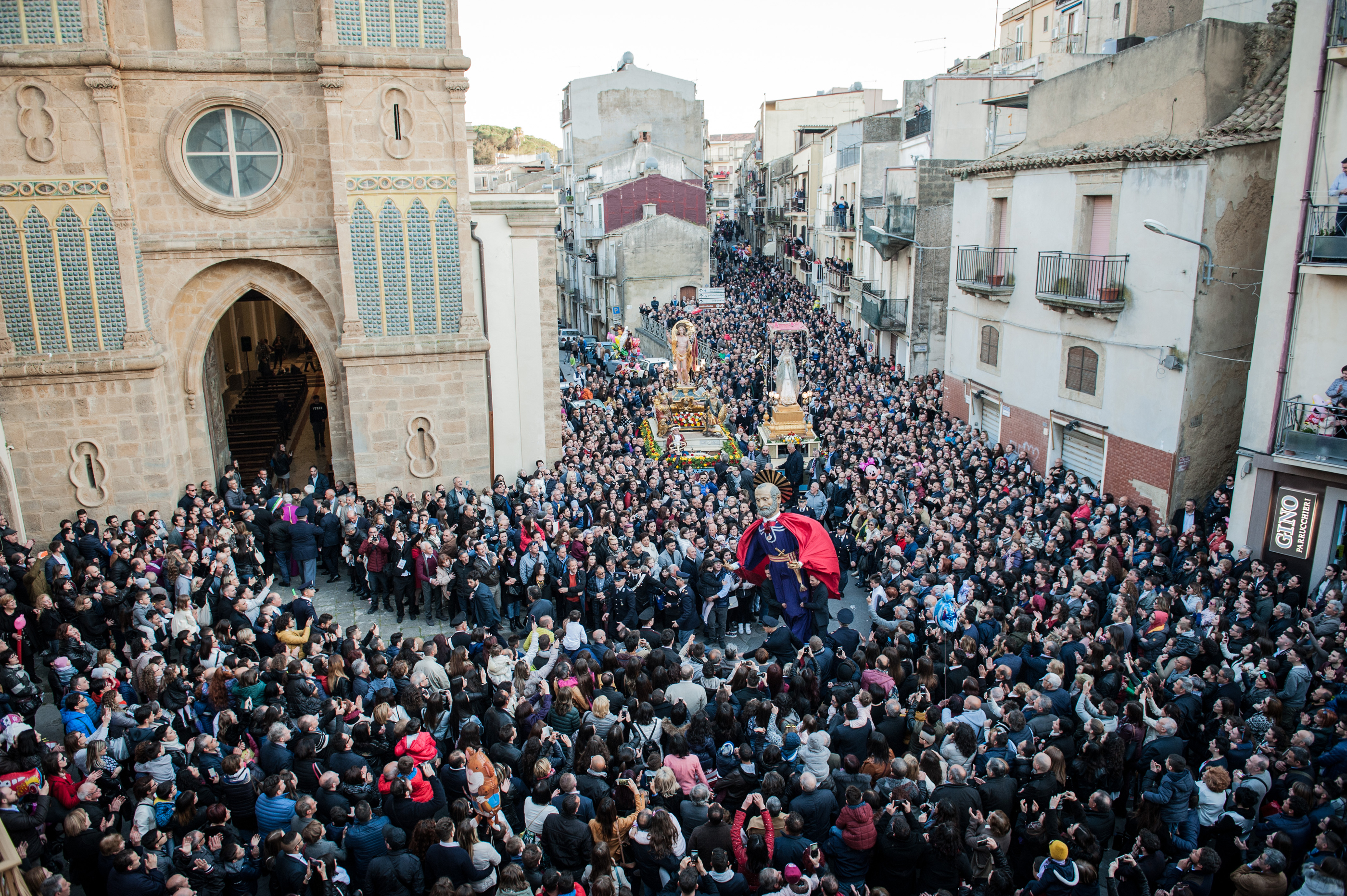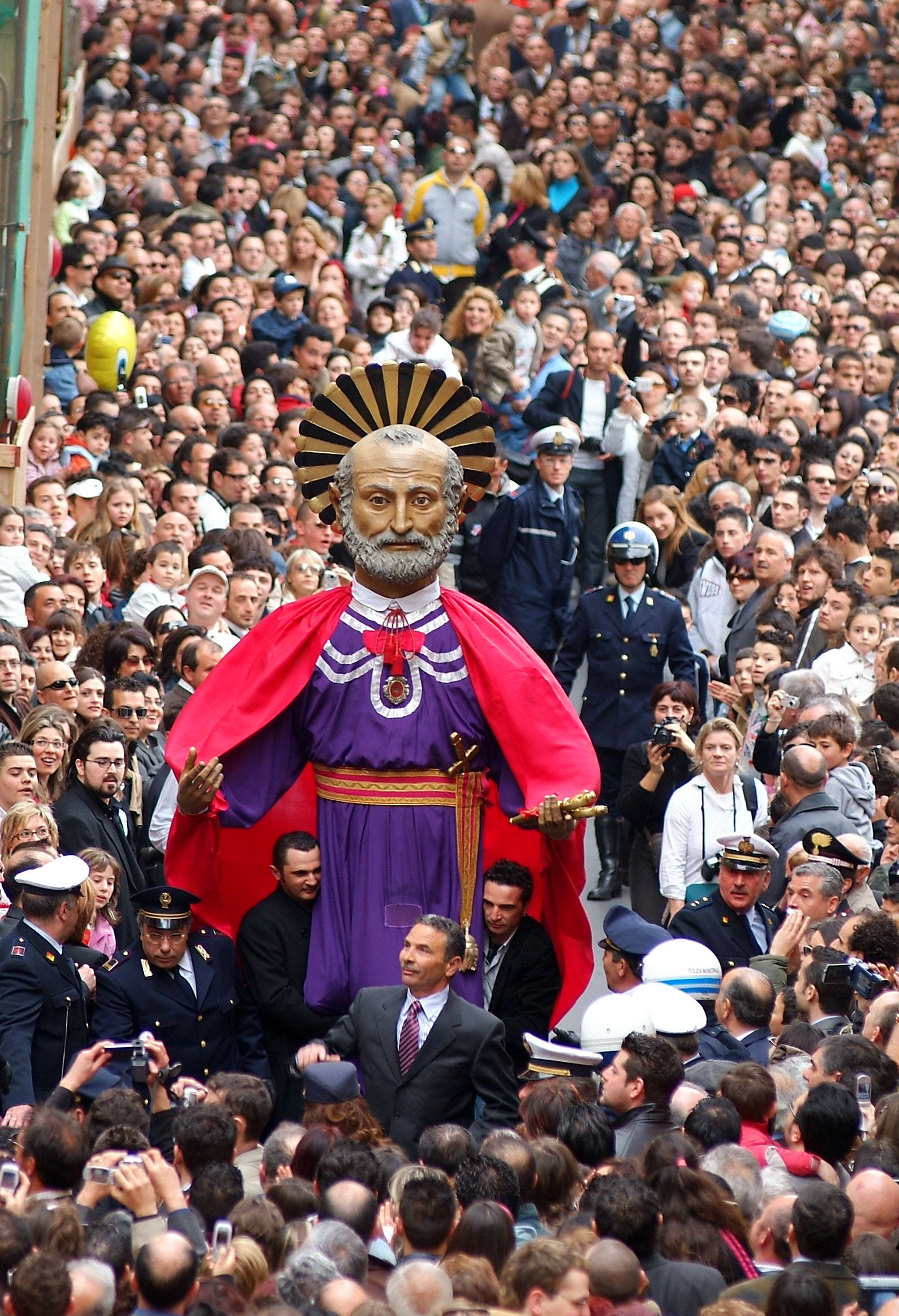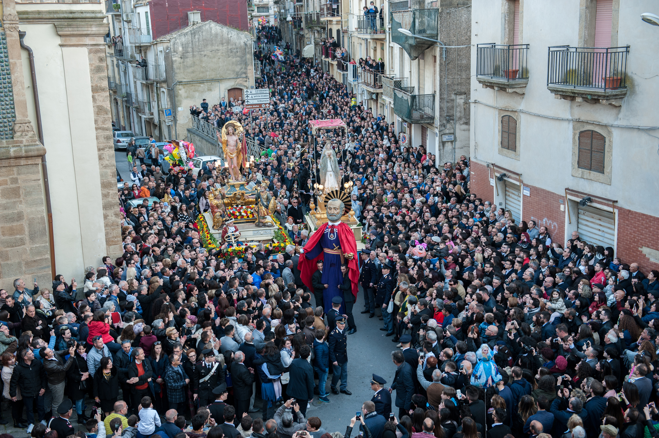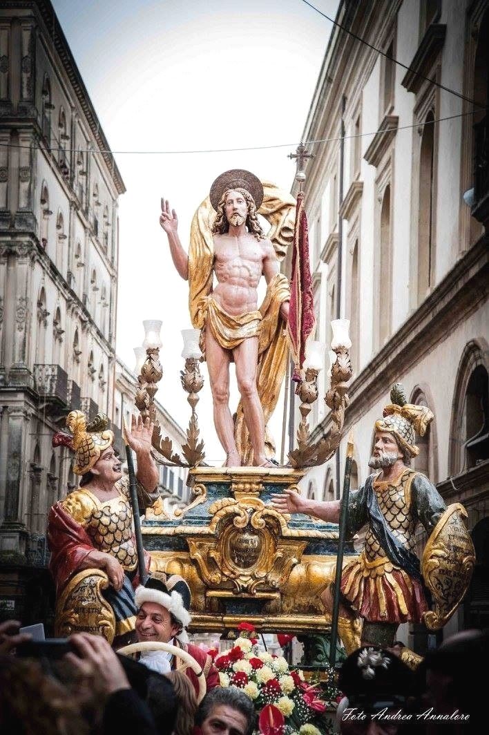 San Pietro, gigantesca figura in cartone pressato, vuota all’interno per permettere di accogliere un robusto portatore che, membro di una famiglia che da generazioni si tramanda questo “onore”, ha accanto due assistenti-portatori, appena scorge la statua dorata del Cristo Risorto, corre a cercare Maria per darle la buona notizia, mentre il suo rosso mantello si gonfia attraendo gli sguardi dei tanti bambini che ogni anno presenziano a questo evento. Raggiunta Maria, fra la Piazza del Municipio e la via Luigi Sturzo, è il momento del “nuncio”, le campane suonano a festa mentre la folla gioisce.