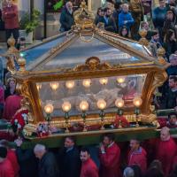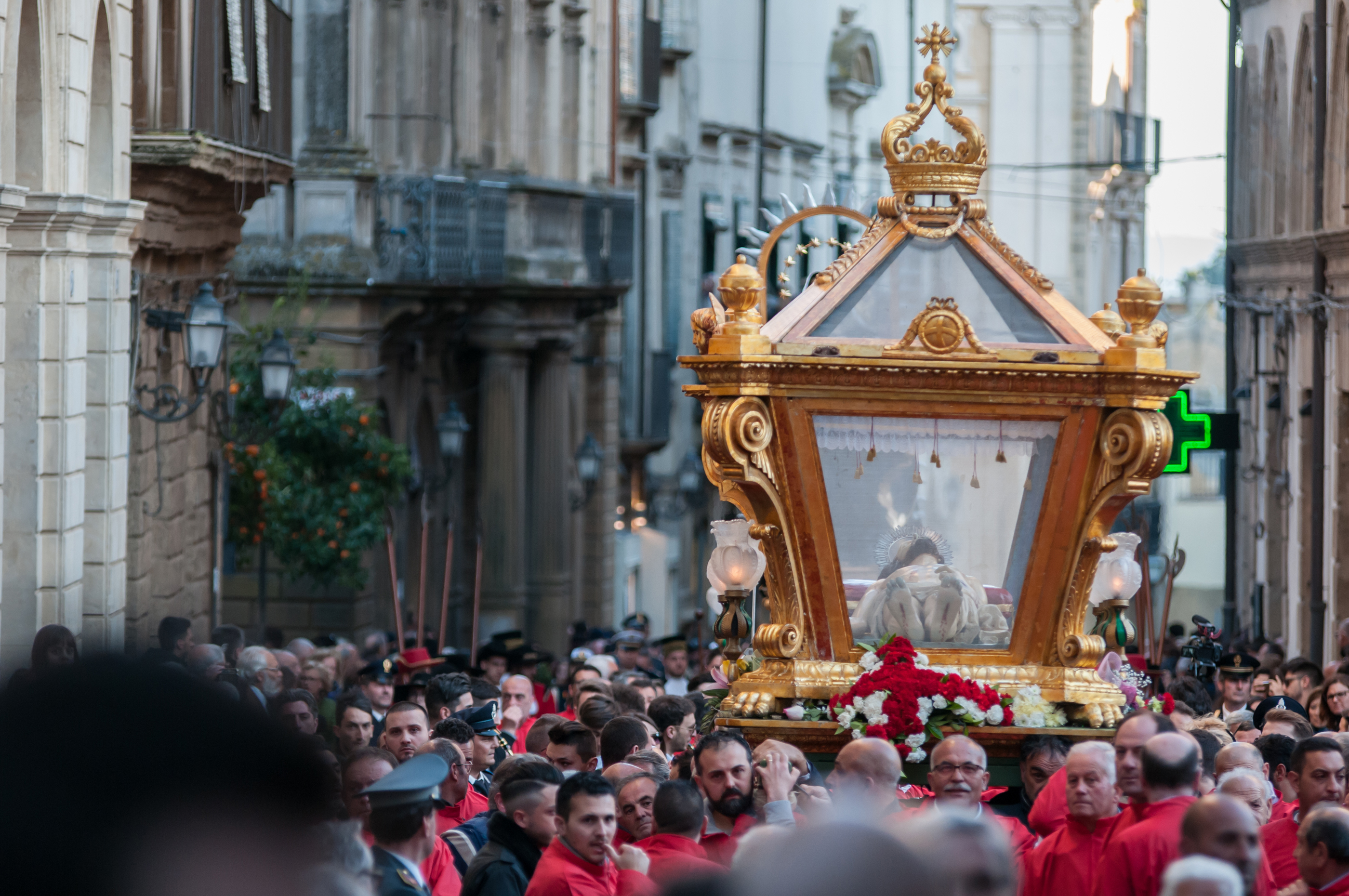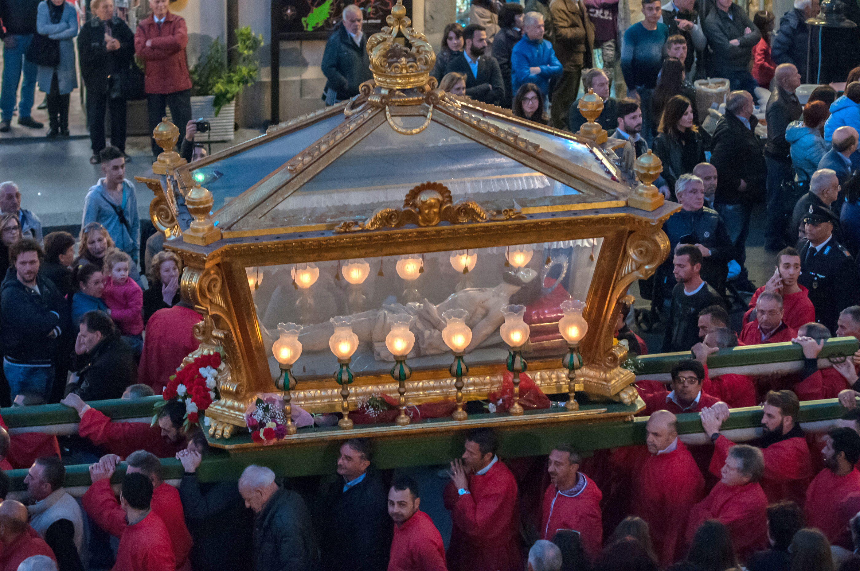 Tra la folla si erge “a vara”, il cosiddetto “cataletto”, portata a spalla dai fedeli che indossano una tonaca rossa fiammeggiante: è un’urna di legno dorato e vetro che racchiude il Cristo che giace morto, una scultura lignea di pregio opera di Giuseppe Vaccaro.