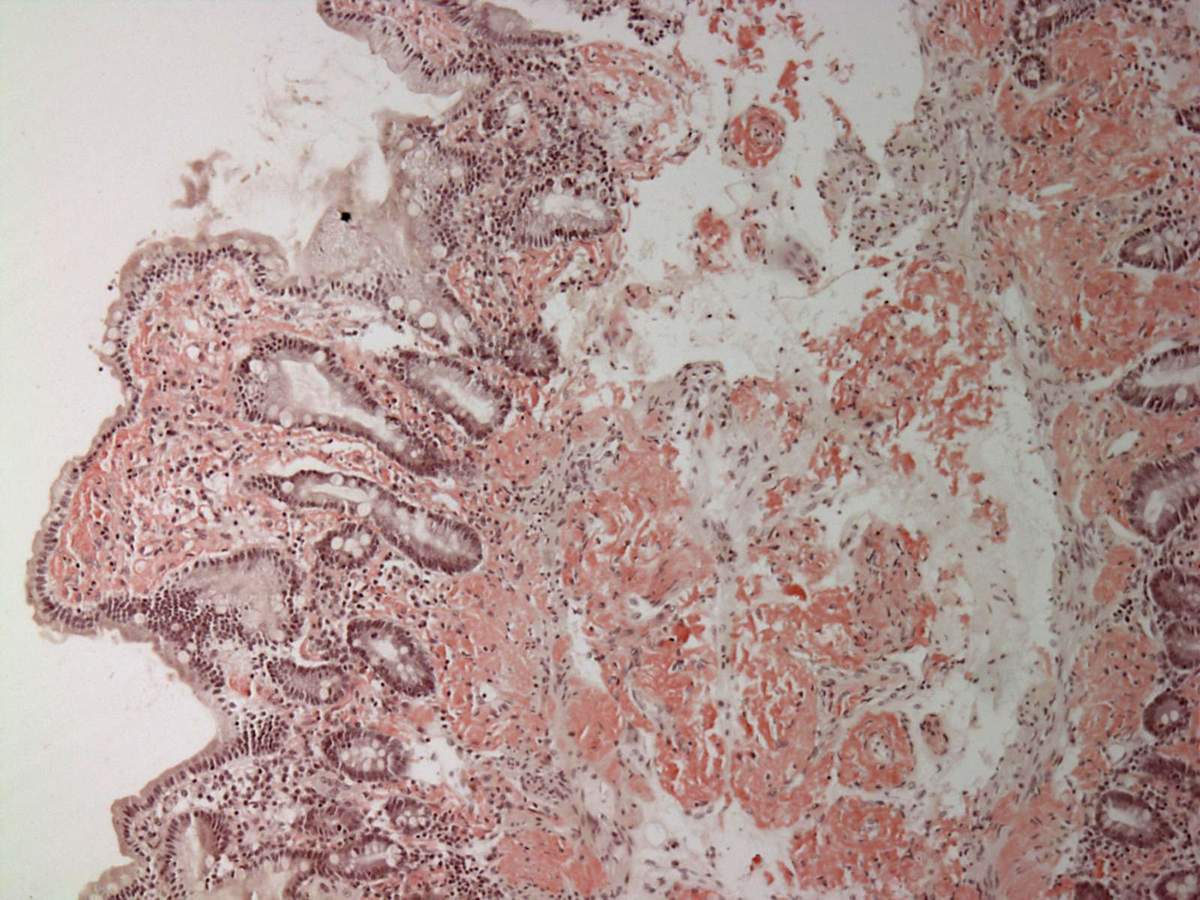 Deposito di amiloide nel duodeno, colorato con il rosso Congo.